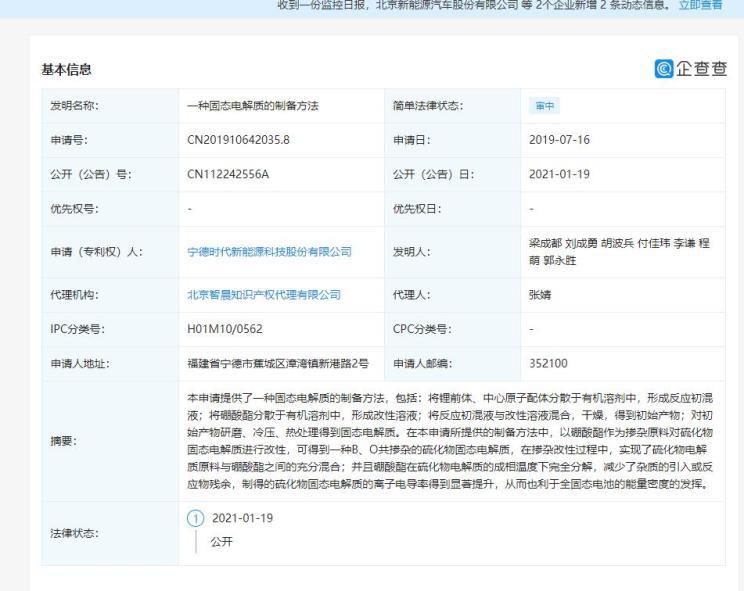 其中第一條公開號為CN112242556A,專利摘要顯示,本申請?zhí)峁┝艘环N固態(tài)電解質(zhì)的制備方法,包括:將鋰前體、中心原子配體分散于有機溶劑中,形成反應(yīng)初混液;將硼酸酯分散于有機溶劑中,形成改性溶液;將反應(yīng)初混液與改性溶液混合,干燥,得到初始產(chǎn)物;對初始產(chǎn)物研磨、冷壓、熱處理得到固態(tài)電解質(zhì)。在本申請所提供的制備方法中,制得的硫化物固態(tài)電解質(zhì)的離子電導(dǎo)率得到顯著提升,從而也利于全固態(tài)電池的能量密度的發(fā)揮。