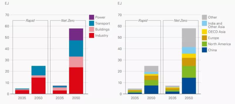 圖7 2035和2050年不同部門和不同地區(qū)氫能消費(fèi)量