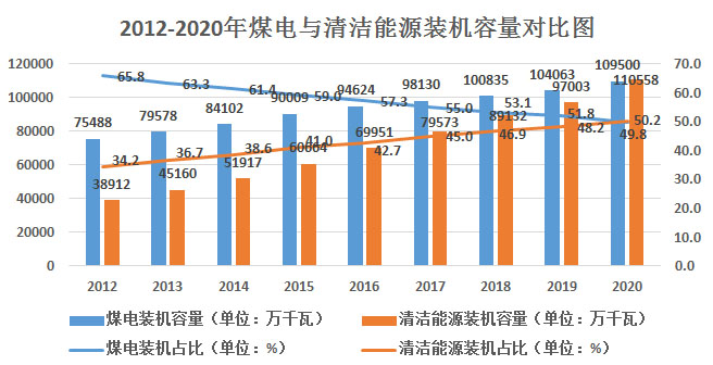 根據(jù)中電傳媒記者數(shù)據(jù)庫(kù),2012年以來(lái)我國(guó)煤電設(shè)備容量保持低位增長(zhǎng),從2012年的7.55億千瓦增長(zhǎng)到2020年的10.95億千瓦左右,年平均增長(zhǎng)4.5%左右。同期,清潔發(fā)電裝機(jī)比重則從2012年的3.89億千瓦增長(zhǎng)到2020年的11.06億千瓦左右,年平均增長(zhǎng)率高達(dá)13.9%。