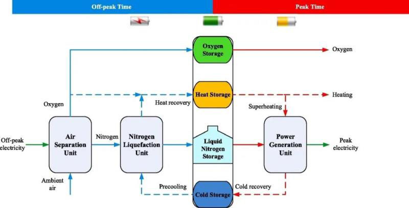 目前獨(dú)立的液態(tài)空氣儲(chǔ)能(LAES)系統(tǒng)面臨的一個(gè)挑戰(zhàn)是經(jīng)濟(jì)效益有待提升,僅通過(guò)電價(jià)套利,其投資回收期約15年。為了解決這一問(wèn)題,科研人員首次提出了一種多功能(多聯(lián)產(chǎn))的LAES系統(tǒng),它不僅能產(chǎn)生峰值電能,還能提供純氧和加熱功能。該系統(tǒng)由空分裝置(ASU)、氮?dú)庖夯b置(NLU)和發(fā)電裝置(PGU)組成。
