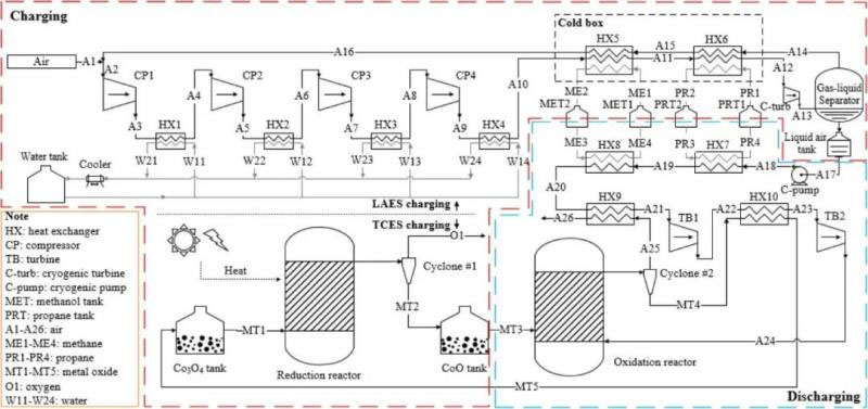 科研人員提出了一種新型的液態(tài)空氣與熱化學(xué)儲(chǔ)能耦合系統(tǒng),基于這兩個(gè)子系統(tǒng)的協(xié)同效應(yīng),該集成的儲(chǔ)能系統(tǒng)在許多方面都優(yōu)于獨(dú)立的液態(tài)空氣儲(chǔ)能和熱化學(xué)儲(chǔ)能技術(shù),具有較高儲(chǔ)能密度、較高儲(chǔ)能效率、無(wú)地理限制和無(wú)環(huán)境污染等優(yōu)勢(shì)。更具體地,液態(tài)空氣儲(chǔ)能子系統(tǒng)確保了空氣的最小存儲(chǔ)體積和集成系統(tǒng)的高儲(chǔ)能效率,而熱化學(xué)儲(chǔ)能子系統(tǒng)允許其具有高儲(chǔ)能密度和高工作溫度,而無(wú)需燃燒化石燃料。