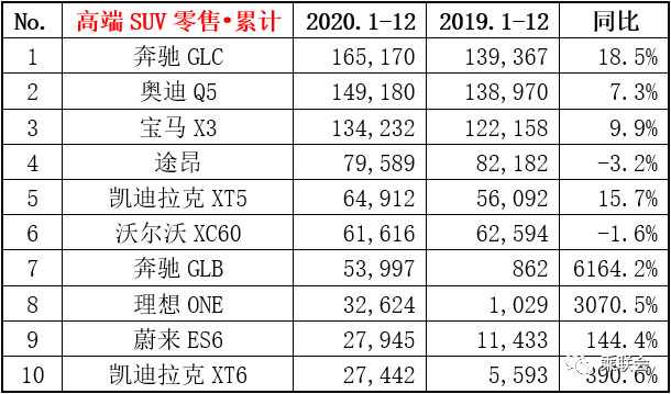 高端SUV排行榜2020年1-12月份零售銷量榜行榜榜單 單位 / 輛 來源 / 乘聯(lián)會(huì)