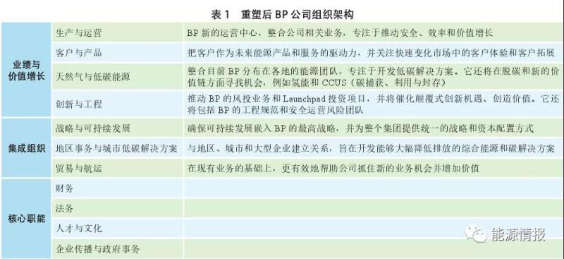 2020年初,BP公司宣布組織重構(gòu)方案,變革傳統(tǒng)業(yè)務(wù)劃分模式,打破專業(yè)、資源、技術(shù)等的分割,優(yōu)化組織架構(gòu),從而促進(jìn)產(chǎn)業(yè)鏈一體化協(xié)同創(chuàng)新作用的發(fā)揮。變革后的組織架構(gòu)中重新設(shè)立了全新四大業(yè)務(wù)板塊、三大集成部門和四大職能部門(見(jiàn)表1)。四大業(yè)務(wù)板塊包括生產(chǎn)與運(yùn)營(yíng)、客戶與產(chǎn)品、天然氣與低碳能源、創(chuàng)新與工程,將新能源提升為與油氣生產(chǎn)運(yùn)營(yíng)并重的獨(dú)立板塊。而三大集成部門包括戰(zhàn)略與可持續(xù)發(fā)展、地區(qū)事務(wù)與城市低碳、貿(mào)易與航運(yùn),主要目標(biāo)是發(fā)現(xiàn)新機(jī)遇并將其價(jià)值最大化。從更加敏捷和高效支持業(yè)務(wù)運(yùn)營(yíng)出發(fā),設(shè)立了財(cái)務(wù)、法務(wù)、人才與文化和企業(yè)傳播與政府事務(wù)等四大核心部門。