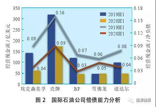 近年來(lái),BP公司資產(chǎn)負(fù)債率逐年上升,負(fù)債承壓較重,截至2020年二季度,資產(chǎn)負(fù)債率達(dá)68.5%,遠(yuǎn)高于其他國(guó)際石油公司同期水平。同時(shí),BP的經(jīng)營(yíng)凈現(xiàn)金流匱乏愈發(fā)嚴(yán)重,上半年僅為46.9億美元,同比下降61.3%,遠(yuǎn)低于同為“三超”公司的??松梨诤蜌づ疲ń?jīng)營(yíng)凈現(xiàn)金流分別為62.8億美元和174.2億美元)。相對(duì)應(yīng)地,BP公司短期償債能力急劇下降,2020年上半年經(jīng)營(yíng)凈現(xiàn)金流/長(zhǎng)短期借款比例僅為0.03,處于五大國(guó)際石油公司末位(見(jiàn)圖2)。