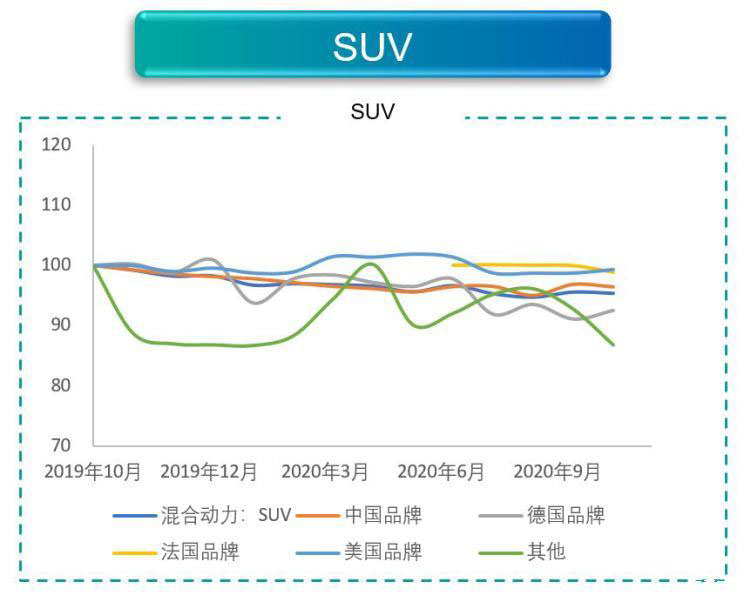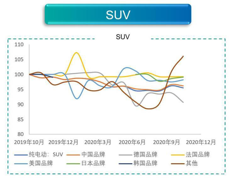 SUV市場則是群雄爭霸了。不過在SUV領(lǐng)域是中國品牌為主導(dǎo),中國品牌產(chǎn)品的數(shù)量以及銷量遠(yuǎn)大于其他國別產(chǎn)品的總和,尤其是蔚來等幾個新勢力的銷量表現(xiàn)不錯,上述原因致使市場整體走勢與中國品牌基本一致。不過隨著大眾ID.4在國內(nèi)的上市,我們預(yù)計未來SUV市場的價格趨勢還會發(fā)生改變。