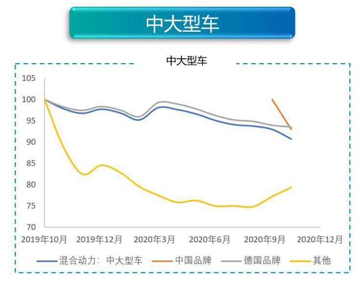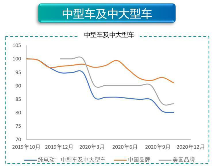 中型車以及中大型車市場目前主要以中國品牌和美國品牌為主。雖然中國品牌有比亞迪漢、小鵬P7等明星產(chǎn)品,但是從市場銷量來看,特斯拉Model 3占據(jù)了主導(dǎo)地位。所以我們可以看到市場的走勢與美國品牌的走勢基本一致。之所以下滑嚴(yán)重,想必大家都很了解——Model 3在國內(nèi)的價格是一降再降。反觀中國品牌,價格波動幅度基本在5%以內(nèi)。