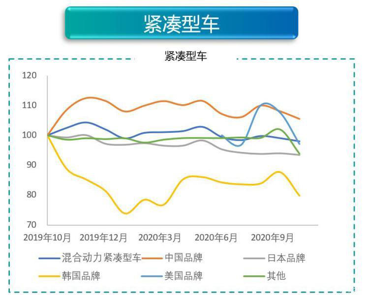 緊湊型車市場的競爭依舊是最激烈的,可以看出細(xì)分市場的整體趨勢與中國品牌和日本品牌的波動保持一致。這是因為該級別市場的銷量主要由這兩個過別的產(chǎn)品占據(jù),來自中國品牌的有比亞迪秦、榮威ei6等,來自日本品牌的主要是卡羅拉和雷凌??梢宰⒁獾巾n系品牌的價格波動比較大,這是因為領(lǐng)動插電式混動版的價格有較大波動。