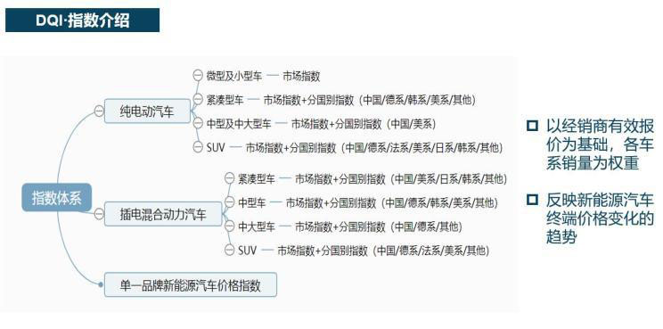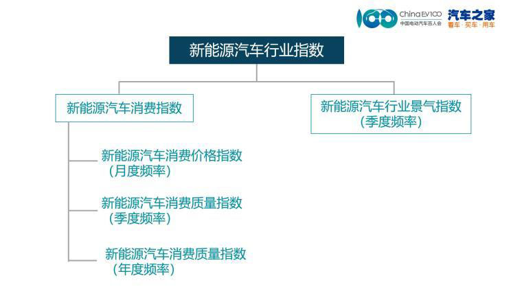 “新能源汽車行業(yè)指數(shù)”由“消費指數(shù)”和“行業(yè)景氣指數(shù)”為主要構(gòu)成。其中,消費指數(shù)再下分3個分指數(shù),分別為消費價格指數(shù)(月度頻率)、消費質(zhì)量指數(shù)(季度頻率)和消費潛力指數(shù)(年度頻率)。