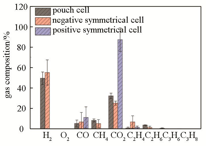 圖4 0.1 C/0.1 C倍率循環(huán)20周后,GC色譜檢測到的全電池、負極對稱電池及正極對稱電池中所生成的氣體成分
