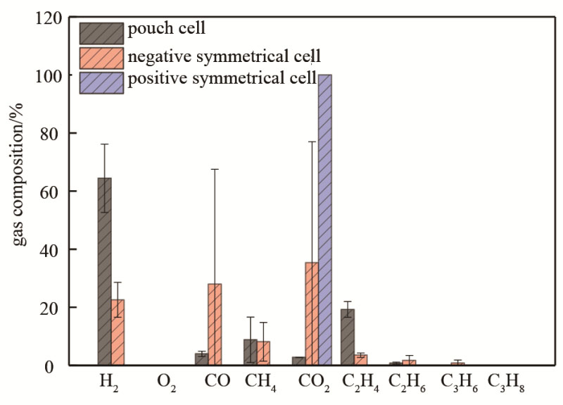 圖6 GC色譜檢測到的全電池、負極對稱電池及正極對稱電池過充后所生成的氣體成分