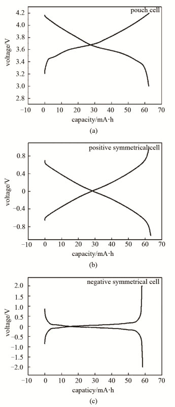 可充放電的對稱電池是從兩個容量相近(容量為Q)但SOC不同的兩只電池上拆解組成的。如A和B兩只電池,若A電池為100%SOC,B電池為0%SOC。將兩只電池拆解后組裝成負極對稱電池,負極對稱電池容量為Q,同理,組裝成的正極對稱電池容量仍為Q。因此,在選定的電壓范圍內,正負極對稱電池的充放電容量應與全電池相近。