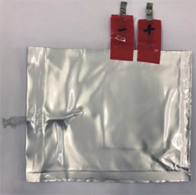 由于單層疊片軟包電池產(chǎn)氣量低,無法直接取氣進行氣相色譜檢測。于鋁塑膜中插入一根聚丙烯(PP)管以抽取氣體,并通過T型硅膠塞密封PP管。氣相色譜采樣針可多次通過硅膠塞抽氣,同時保證密封性。該器件的成功制作應注意以下三點:①管子材質與鋁塑膜內密封層材質相同,均為PP材質;②PP管內徑(4 mm×2.5 mm)與T型硅橡膠塞外徑(2.5 mm)相同;③ 銅線(直徑約0.5 mm)應插入PP管內,保證PP管和鋁塑膜密封后預留采氣通道,鋁塑膜密封條件為185 ℃熱壓20 s,最終在線采氣裝置見圖2。