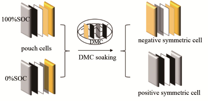 本文所用的正負極均為新鮮電極片,極片來自國軒高科動力能源有限公司,三元材料NCM和人造石墨原料分別來自供應商廈門鎢業(yè)和深圳市貝特瑞新能源材料股份有限公司。用N-甲基吡咯烷酮(NMP)和去離子水分別擦去雙面涂層正負極片的一側,于80 ℃烘箱中干燥4 h,負極片和正極片分別切割成固定尺寸42 mm×53 mm和40 mm×50 mm。為了防止由于負極片膨脹導致極片卷曲無法裝配對稱電池,應特別注意在擦去負極極片的一側后,將電池級膠帶貼在裸露的銅箔面上。