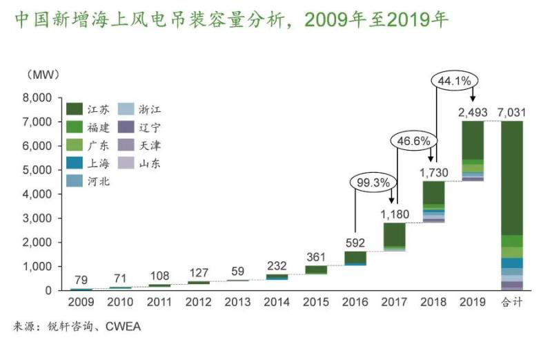 根據(jù)中國可再生能源學會風能專業(yè)委員會歷年統(tǒng)計的吊裝容量數(shù)據(jù),2016年至2019年,中國新增海上風電吊裝容量快速增長,3年間陸續(xù)突破1GW、2GW關口。