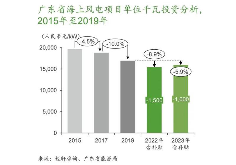 由于海床地質(zhì)、海況、天氣等因素,廣東省近年海上風電項目開發(fā)投資降本緩慢。自2017年起,項目規(guī)劃進入5-6MW大兆瓦風機平臺,總體降本有所提升,2019年平均單位千瓦投資降至人民幣16,938元。根據(jù)該意見提出的經(jīng)濟扶持水平,2022年扶持降本可達8.9%、2023年達5.9%(較2019年水平,不考慮其他降本因素)。該經(jīng)濟扶持方案與往年行業(yè)平均降本水平相當。