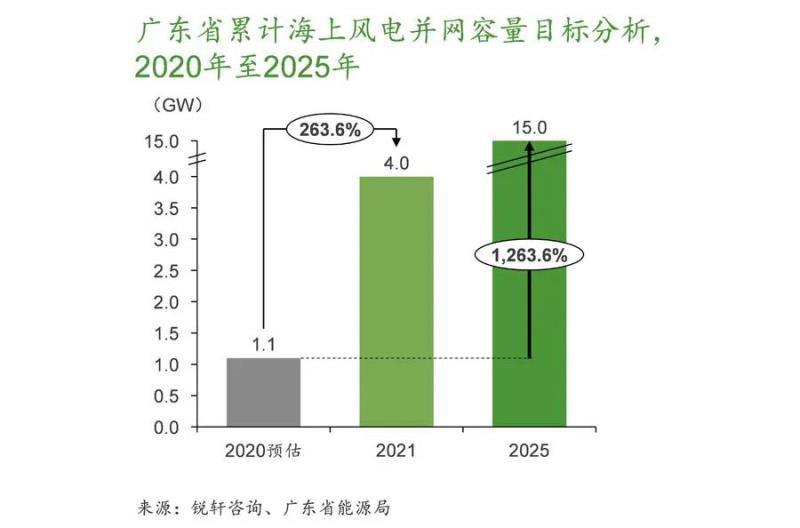 該意見提出較為樂觀的發(fā)展目標。根據(jù)項目進展情況,截止2020年末,預計廣東省累計并網(wǎng)海上風電容量1.1GW,與該意見的2021年目標相比需當年新增3.9GW?!笆奈濉逼陂g,目標共新增13.9GW,累計海上風電并網(wǎng)容量暴增1263.6%。