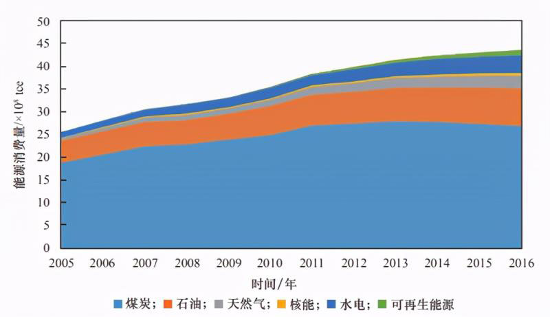 圖 1 2005—2016 年我國能源消費(fèi)結(jié)構(gòu)趨勢圖