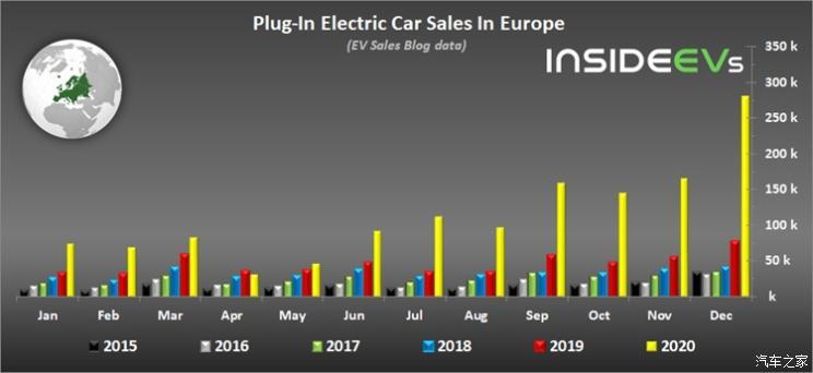 具體而言,在2020年12月歐洲登記的新能源乘用車銷量達(dá)到281171輛,同比增長了254%,并占到當(dāng)月歐洲市場總銷量的23%。