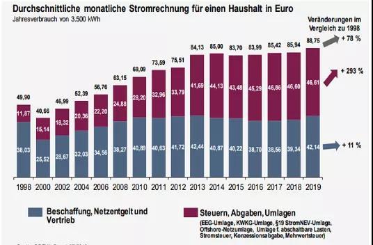 圖3所示,德國近20年批發(fā)市場的基準價分別從2000年的每兆瓦時17.2歐元上漲到2019年的42.2歐元,尖峰價格更是在2008年沖到了129歐元,近十年基本保持在30至70歐元之間。從圖4可看出,從1998年至2019年電價78%的漲幅中,發(fā)電和輸電、配電成本只增長了11%,各種稅費上漲近293%。德國的居民電價里,各種稅費(再生能源補貼、增值稅、電力稅、公共土地費)貢獻了超過一半。其中,再生能源補貼就占了電價的21-23%,該項補貼從2006年的約0.8歐分/千瓦時增至2019年每千瓦時6.405歐分/千瓦時。