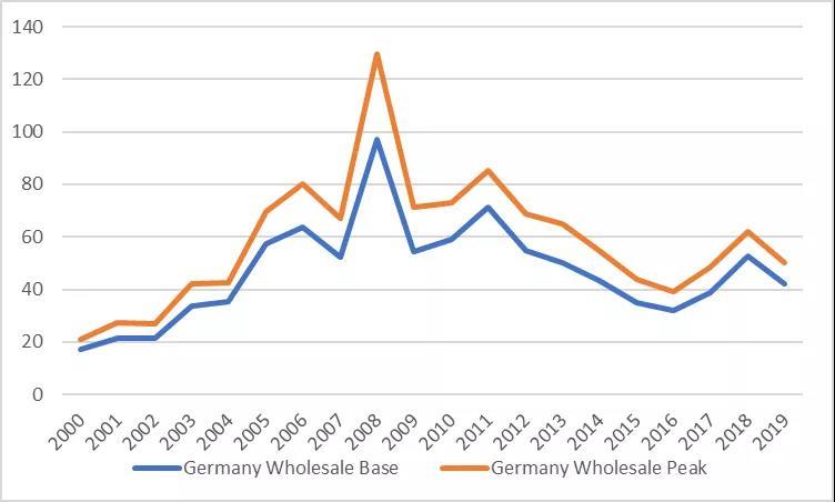 圖 3 德國近20年現(xiàn)貨市場基準價格及尖峰價格(單位:歐元/MWh)