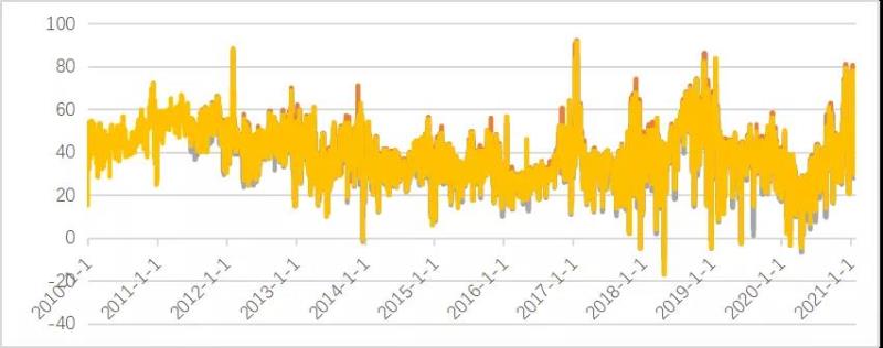 圖 2 德國日前電力市場價格(2010-2021,單位:歐元/MWh)
