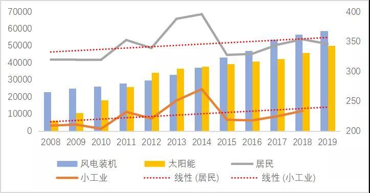圖 1德國風光裝機變化與居民和小工業(yè)電價的變化情況(2008-2019)