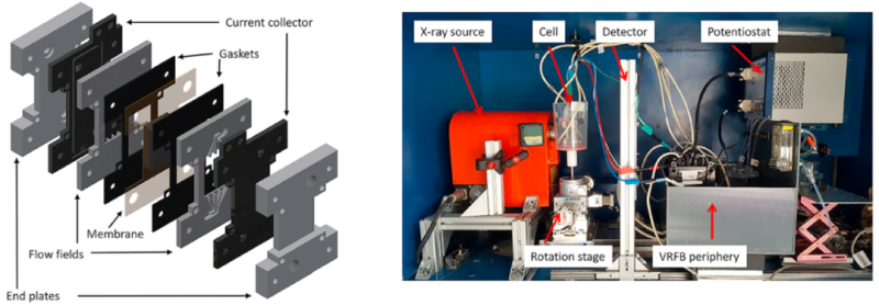 來自拜羅伊特大學(xué)的研究人員提出了一種電池設(shè)計,可以同時實現(xiàn)電化學(xué)電池測試和X-射線成像。該特殊設(shè)計允許在實驗室尺度尺寸下使用實驗室微CT或者同步X-射線輻射檢測固態(tài)鉍相的溶解和再沉積現(xiàn)象,具有足夠的時間和空間分辨率。基于該裝置,研究了兩種不同的鉍改性碳氈作為VRFB負電極,并與傳統(tǒng)的無鉍類似物進行了比較。他們證明,鉍相的穩(wěn)定性很大程度上取決于電解質(zhì)的電荷狀態(tài)(SOC),在SOC = 0時表現(xiàn)出非法拉第溶解。同時發(fā)現(xiàn),電池性能與沉積的氧化鉍的數(shù)量和分布或溶解在電解質(zhì)中的鉍的數(shù)量無關(guān),這使鉍作為非均相催化劑的增強作用受到質(zhì)疑。
