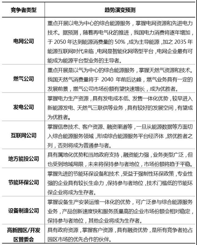 其他類型競(jìng)爭(zhēng)者將憑借各自不同的優(yōu)勢(shì)參與市場(chǎng)競(jìng)爭(zhēng),由于當(dāng)前不具備成為優(yōu)勝者的潛力,隨著綜合能源服務(wù)技術(shù)壁壘的不斷提升,未來(lái)將成為市場(chǎng)參與者或生存者。