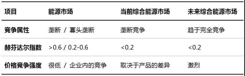 市場(chǎng)結(jié)構(gòu)包括壟斷、寡頭壟斷、壟斷競(jìng)爭(zhēng)和完全競(jìng)爭(zhēng)等四大類。從本質(zhì)上講,綜合能源服務(wù)是競(jìng)爭(zhēng)性市場(chǎng)業(yè)務(wù),綜合能源服務(wù)市場(chǎng)應(yīng)屬于完全競(jìng)爭(zhēng)市場(chǎng)。但是,傳統(tǒng)能源市場(chǎng)集中度高,可以對(duì)行業(yè)施加經(jīng)濟(jì)力量的企業(yè)較多。以這些企業(yè)為主體,轉(zhuǎn)型綜合能源服務(wù)商,必將使綜合能源服務(wù)市場(chǎng)集中度快速上升,但不會(huì)高于傳統(tǒng)能源市場(chǎng)。由于缺乏相關(guān)統(tǒng)計(jì)數(shù)據(jù),綜合能源服務(wù)市場(chǎng)企業(yè)集中度或赫芬達(dá)爾指數(shù)難以計(jì)算,無(wú)法確切知曉其市場(chǎng)結(jié)構(gòu),根據(jù)推斷,應(yīng)處于寡頭壟斷和完全競(jìng)爭(zhēng)之間,即壟斷競(jìng)爭(zhēng),而且向完全競(jìng)爭(zhēng)轉(zhuǎn)型不可能一蹴而就。