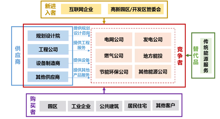 總體來(lái)看,由電網(wǎng)公司、發(fā)電公司、燃?xì)夤?、地方能投等?gòu)成的投資主體,以及由規(guī)劃設(shè)計(jì)院、工程公司、設(shè)備制造商等構(gòu)成的供應(yīng)商,是該行業(yè)的主要競(jìng)爭(zhēng)力來(lái)源。以互聯(lián)網(wǎng)企業(yè)和高新園區(qū)管委會(huì)為主要代表的新進(jìn)入者正在向綜合能源服務(wù)市場(chǎng)緩慢滲透。購(gòu)買者的溢價(jià)能力不強(qiáng),受制于能源信息的不充分公開(kāi)透明。綜合能源服務(wù)和傳統(tǒng)能源服務(wù)互為替代品,傳統(tǒng)能源服務(wù)的競(jìng)爭(zhēng)力正逐漸喪失。