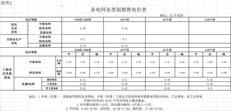 工商業(yè)及其他用電價(jià)格:繼續(xù)執(zhí)行中部電網(wǎng)工商業(yè)及其他用電價(jià)格0.66元/千瓦時(shí),并執(zhí)行豐枯、峰谷分時(shí)電價(jià),阿里電網(wǎng)工商業(yè)及其他用電價(jià)格由1.61元/千瓦時(shí)調(diào)整為0.66元/千瓦時(shí),即中部、阿里電網(wǎng)工商業(yè)及其他用電價(jià)格在豐水期(每年5-10月)0.64元/千瓦時(shí),在枯水期(每年1-4月和11-12月)0.675元/千瓦時(shí)。
