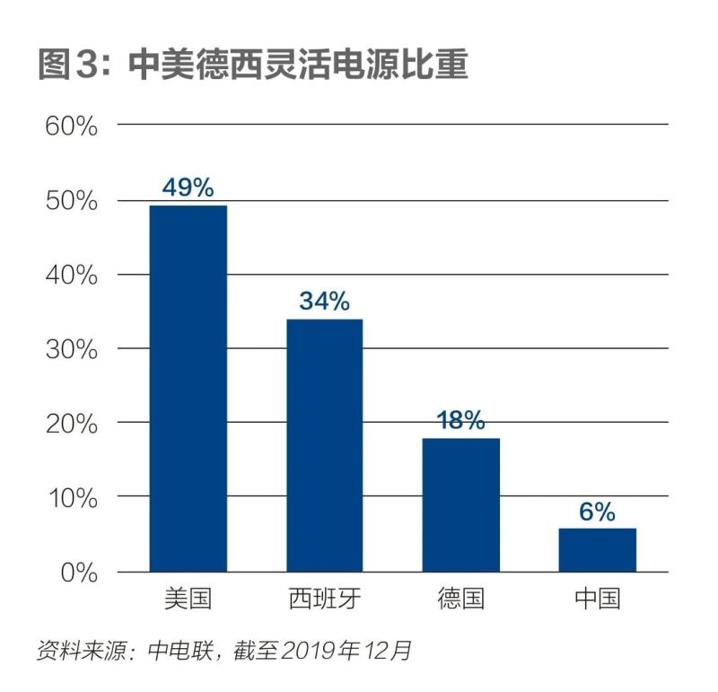 中電聯(lián)2019年12月發(fā)布的《煤電機(jī)組靈活性運(yùn)行政策研究》顯示,歐美國(guó)家的靈活電源比重普遍較高,西班牙、德國(guó)、美國(guó)占比分別為34%、18%、49%,而中國(guó)占比不到6%。在中國(guó)新能源資源富集的三北地區(qū),風(fēng)電、太陽能發(fā)電裝機(jī)分別占全國(guó)的72%、61%,但靈活調(diào)節(jié)電源還不足3%。