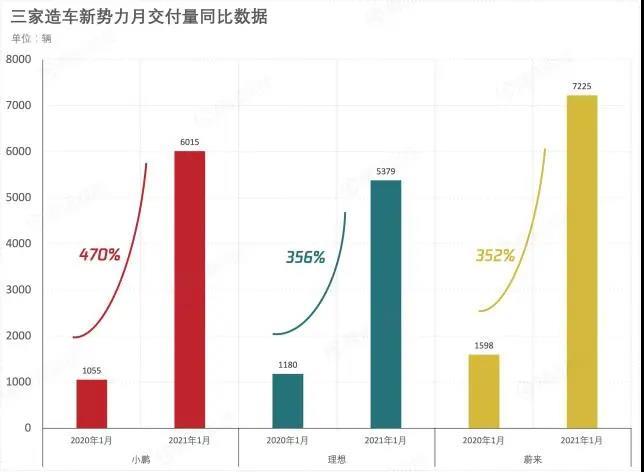 中國儲能網(wǎng)訊:剛剛進入2月,小鵬、理想和蔚來三家造車新勢力就相繼發(fā)布了2021年1月的新車整體交付量數(shù)據(jù)。三家車企同比增速均超過了350%,其中小鵬汽車的增速甚至高達470%。