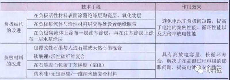 文獻(xiàn)通過(guò)對(duì)專利的分析也認(rèn)為解決碳負(fù)極材料安全性的方法主要有降低負(fù)極材料的比表面積、提高SEI膜的熱穩(wěn)定性。在現(xiàn)有的國(guó)內(nèi)專利申請(qǐng)中,改進(jìn)負(fù)極材料及結(jié)構(gòu)進(jìn)而提高電池安全性能的相關(guān)技術(shù)。