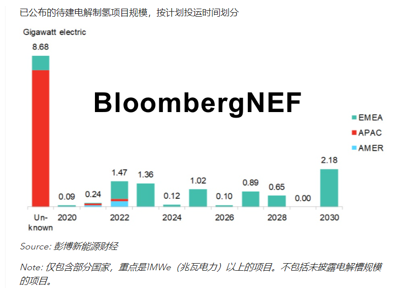 目前彭博新能源財(cái)經(jīng)追蹤到的已宣布的待建電解制氫項(xiàng)目規(guī)模