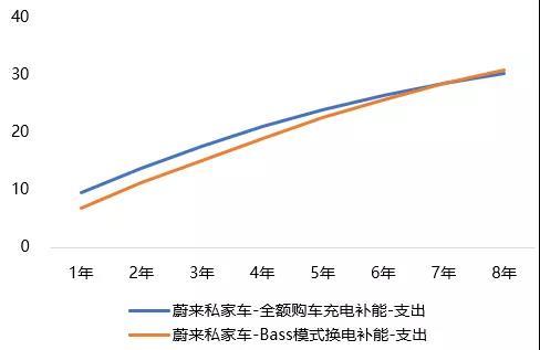 圖 | 蔚來全額購車與車電分離模式下經(jīng)濟性對比(萬元)(折現(xiàn)率3%,考慮殘值)