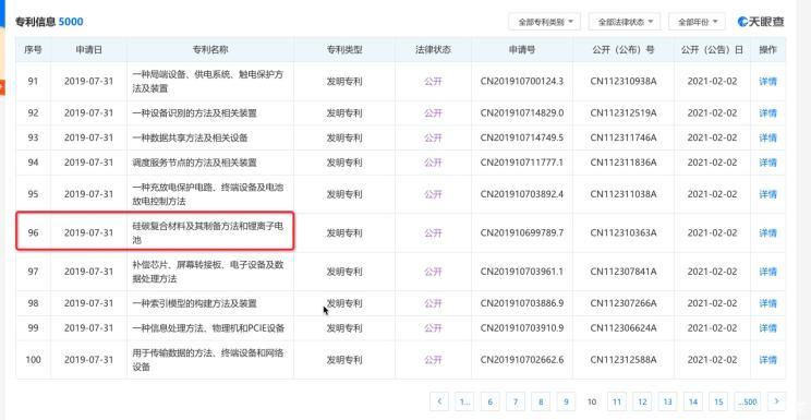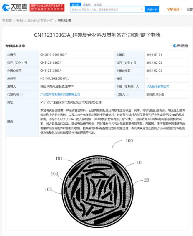 我們從天眼查App上查詢到,在近日,華為技術(shù)有限公司公開“硅碳復(fù)合材料及其制備方法和鋰離子電池”發(fā)明專利,公開號(hào)為CN112310363A。