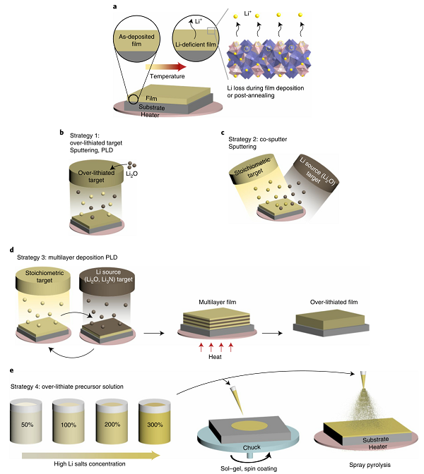 在鋰基氧化物的情況下,鋰在沉積過程中容易損失(圖5a),經(jīng)常導(dǎo)致非化學(xué)計量比的膜。為了補償沉積過程中的鋰損失,濺射膜的兩個靶的共沉積(圖5c)和PLD膜的過鋰化陶瓷目標(biāo)的共沉積(圖5b)是所使用的典型策略。然而,對于僅使用過鋰化陶瓷顆粒作為靶的PLD膜來說,大多數(shù)結(jié)晶固態(tài)電解質(zhì)材料(包括LLZO和LLTO)和電極材料(包括尖晶石和層狀材料)在其高鋰化相中的穩(wěn)定是困難的。最近,在沉積期間,采用內(nèi)部鋰源的陶瓷處理被引入,使用Li3N和石榴石鋰的第二靶和后退火(圖5d),以成功克服沉積期間的鋰損失。