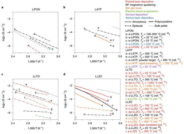 (b)NASICON型LATP薄膜;鈣鈦礦型鋰LLTO薄膜(c)和石榴石型LLZO薄膜(d)及其顆粒導(dǎo)電性的比較。