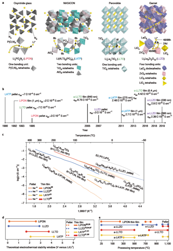 在室溫下達到電導(dǎo)率10-7–10-3 S·cm-1的鋰離子傳導(dǎo)陶瓷是基于氧氮化物玻璃(LiPON)和NASICON型、鈣鈦礦型和石榴石型結(jié)構(gòu)(圖3a)。要將鋰離子傳導(dǎo)陶瓷從傳統(tǒng)的大顆粒轉(zhuǎn)變?yōu)閿?shù)百納米厚的薄膜,需要付出巨大的努力:平均而言,從相應(yīng)的顆粒開始,需要十多年的額外開發(fā)時間來了解陶瓷膜的化學(xué)、沉積和特性(圖3b)。LiPON是一個例外,它的薄膜加工路線是在無定形LiPON顆粒之前建立的。對這些陶瓷薄膜進行加工的未來機遇在于確定其化學(xué)性質(zhì),并更深入地了解其結(jié)構(gòu)、相和鋰離子傳輸之間的關(guān)系,這將在決定它們作為未來固態(tài)電池的“薄”電解質(zhì)方面發(fā)揮作用(圖3c-e)。
