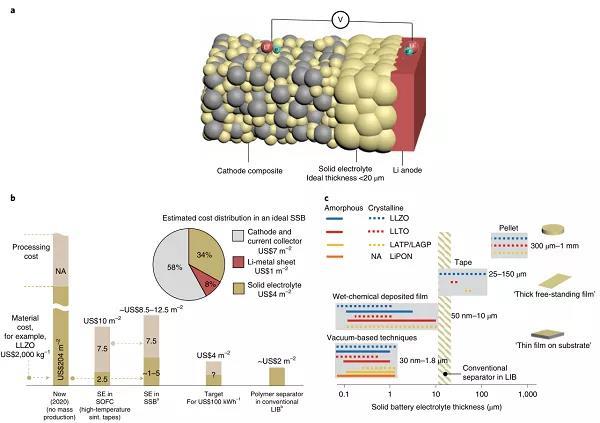 估算固態(tài)電池生產(chǎn)鏈成本(即加工和材料成本)是十分重要的任務(wù)。研究結(jié)果表明,如果我們繼續(xù)依賴傳統(tǒng)的高溫?zé)Y(jié)成條工藝,即使原材料價格低至US$10 kg-1,也會導(dǎo)致氧化物基電池在經(jīng)濟上不可行。最近,根據(jù)能源部的成本目標(biāo)和當(dāng)前0.2k Wh m-2(5 mAh cm-2)的鋰離子電池能量密度,提出了一個大約US$10-12 m-2的固態(tài)電池成本準(zhǔn)則。正極和集流體的估算成本約為US$7 m-2,20 μm鋰金屬箔的估算成本約為US$1 m-2,因此,固體電解質(zhì)的估算成本需低于US$4 m-2 (圖1b)。