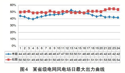 從統(tǒng)計(jì)結(jié)果來看,全省風(fēng)電日最大出力豐期的出力范圍為40%~51%,午后12時到下午5時最大出力較高;枯期的出力范圍為49%~55%,晚上9時到凌晨最大出力較高。
