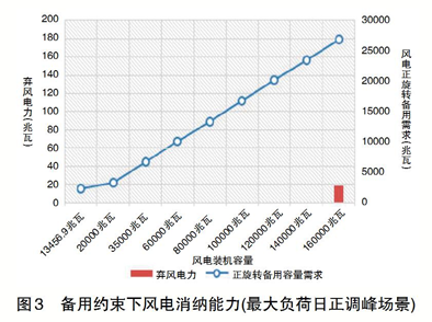 對于備用約束,選取備用需求最大以及火電提供旋備比例最低的場景作為備用約束下的關(guān)鍵場景;逐步增加風(fēng)電裝機(jī)容量,使用軟件進(jìn)行運(yùn)行模擬,直至系統(tǒng)備用不足或者出現(xiàn)棄風(fēng),則該臨界場景下風(fēng)電容量即為備用約束下風(fēng)電可消納容量。