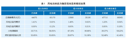 調(diào)峰約束下風(fēng)電消納能力評估。選取確定性場景庫分析指出的影響風(fēng)電消納的調(diào)峰約束關(guān)鍵受限場景:最大峰谷差日反調(diào)峰場景以及最小負(fù)荷日反調(diào)峰場景,逐步增加風(fēng)電裝機(jī)容量,使用軟件進(jìn)行運(yùn)行模擬,直至系統(tǒng)調(diào)峰能力不足出現(xiàn)棄風(fēng),則該臨界場景下風(fēng)電容量即為調(diào)峰約束下風(fēng)電可消納容量。仿真結(jié)果如表2所示。