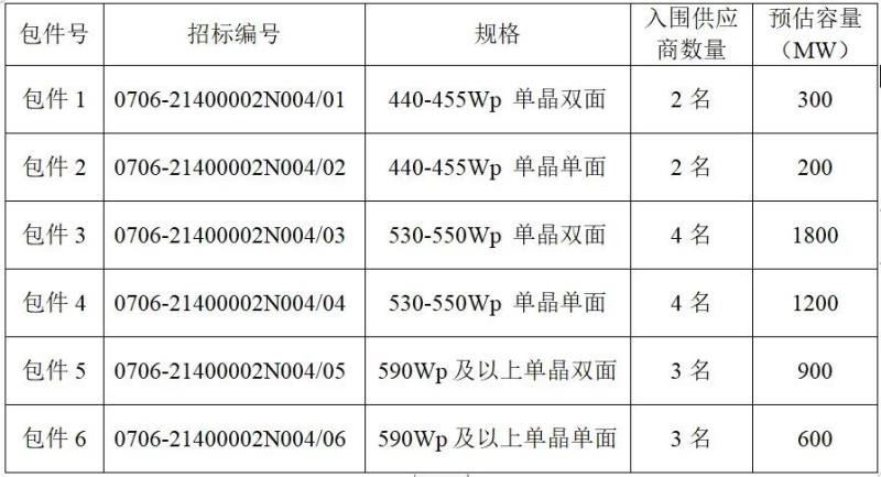 根據(jù)招標(biāo)公告,本次組件框架招標(biāo)采購為服務(wù)于中核匯能有限公司/中核山東能源有限公司/中核豐泰新能源開發(fā)有限責(zé)任公司/其他與中核匯能有限公司一體化管理的機(jī)構(gòu)及所屬項(xiàng)目公司2021年12月31日前的擬開工項(xiàng)目(包括自主投資建設(shè)項(xiàng)目和擬收購項(xiàng)目),預(yù)計(jì)裝機(jī)總量為5GW。招標(biāo)范圍包括(但不限于)光伏組件產(chǎn)品本體、運(yùn)輸供貨到項(xiàng)目現(xiàn)場(chǎng)及保險(xiǎn)費(fèi)(運(yùn)輸費(fèi)標(biāo)注出單價(jià))、專用工具、備品備件、指導(dǎo)安裝組件設(shè)備、配合系統(tǒng)調(diào)試和驗(yàn)收、培訓(xùn)及其它相關(guān)服務(wù)等費(fèi)用。