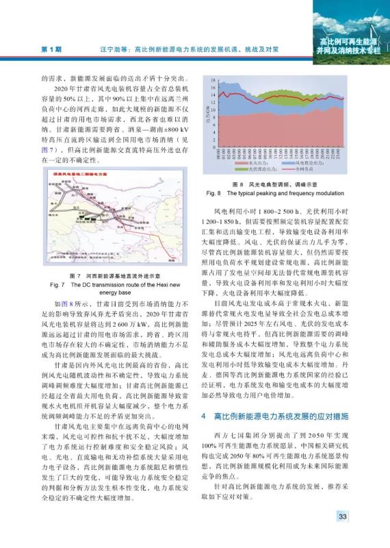 摘要:環(huán)境污染、氣候變化、能源安全和可持續(xù)發(fā)展等問(wèn)題日益突出,全球主要國(guó)家已將新能源列入國(guó)家能源優(yōu)先發(fā)展戰(zhàn)略,高比例新能源發(fā)展面臨重大機(jī)遇與挑戰(zhàn)。在介紹了國(guó)內(nèi)外新能源發(fā)展的背景和現(xiàn)狀的基礎(chǔ)上,分析了中國(guó)大規(guī)模新能源發(fā)展的主要特點(diǎn),以甘肅為例,研究高比例新能源接入電力系統(tǒng)發(fā)展的機(jī)遇,分析了面臨的送出、消納、系統(tǒng)穩(wěn)定、運(yùn)行控制、經(jīng)濟(jì)性和效率等一系列挑戰(zhàn),展望了高比例新能源發(fā)展趨勢(shì)并提出了應(yīng)對(duì)措施。