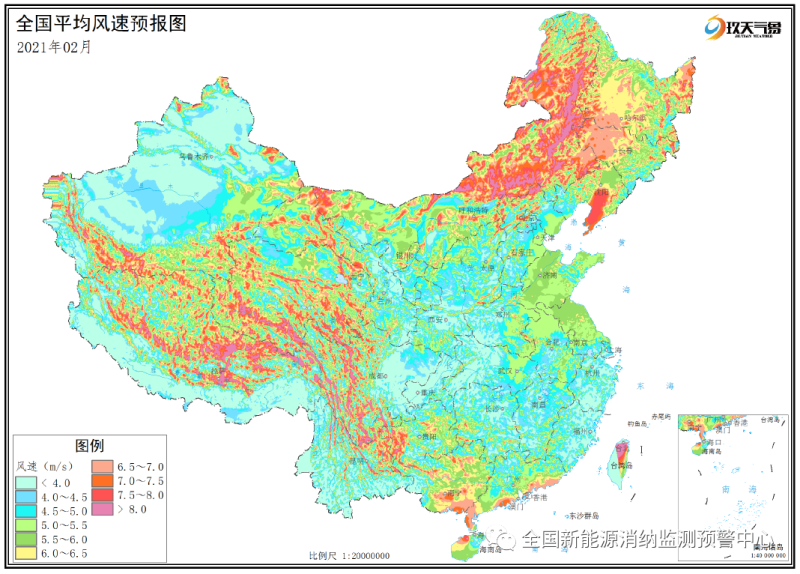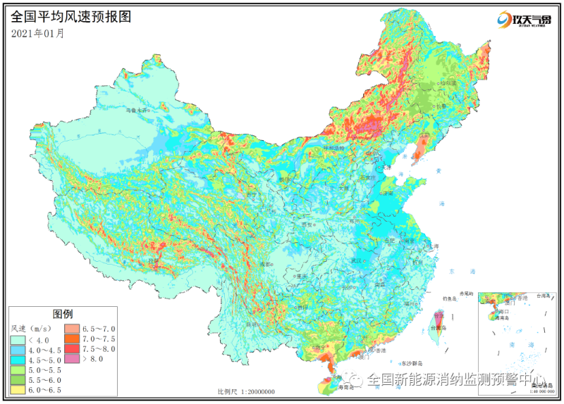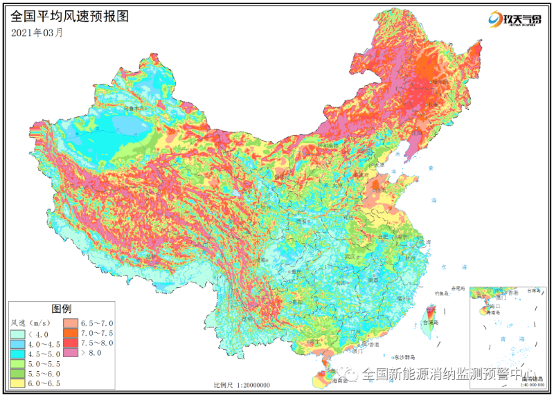 根據(jù)中國氣象局預(yù)測,風(fēng)能資源方面,2021年一季度隨著月份遞增,全國大部地區(qū)風(fēng)速呈增大趨勢,風(fēng)速在3.6m/s~7.2m/s之間。風(fēng)速低值區(qū)一般位于新疆西部和中部、西藏南部、西南地區(qū)東北部和南部等地,平均風(fēng)速一般低于4.0m/s;風(fēng)速高值區(qū)主要位于東北、西北東部的部分地區(qū)、青藏高原、川西高原、云貴高原等地,平均風(fēng)速達(dá)到6.0m/s以上。