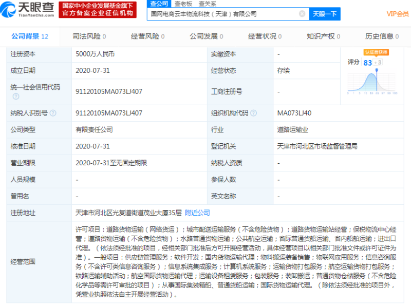 2020年7月31日,國(guó)網(wǎng)電商云豐物流科技(天津)有限公司成立,注冊(cè)資本5000萬。該公司有兩大控股股東,第一是國(guó)網(wǎng)電商科技有限公司,投資2550萬元,持股51%;第二是深圳豐朗供應(yīng)鏈有限公司,投資2450萬元,持股49%。