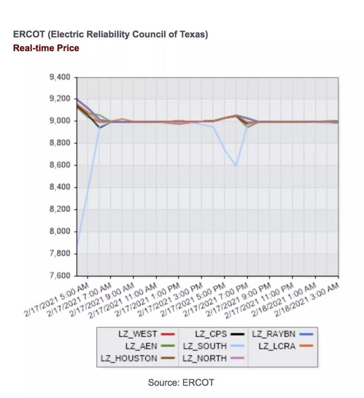 此外,當?shù)貢r間2月17日,ERCOT實時電價幾乎保持在9000美元/MWh。有當?shù)孛襟w報道,此時要充滿一部特斯拉需要花費900美元。