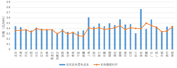 圖2 光伏發(fā)電度電成本與燃煤標(biāo)桿電價對比